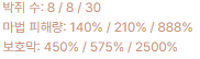 | 능력치 | 체력(750/1350/2430) 공격력(55/83/124) DPS(36/54/81) 공격사거리 1 공격속도 0.65 방어력 45 마법저항력 45 |
