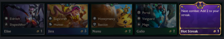 연인 4골드 무작위 5단계 챔피언 1명 및 해당 챔피언과 특성을 공유하는 2단계 챔피언 2명을 획득합니다. |