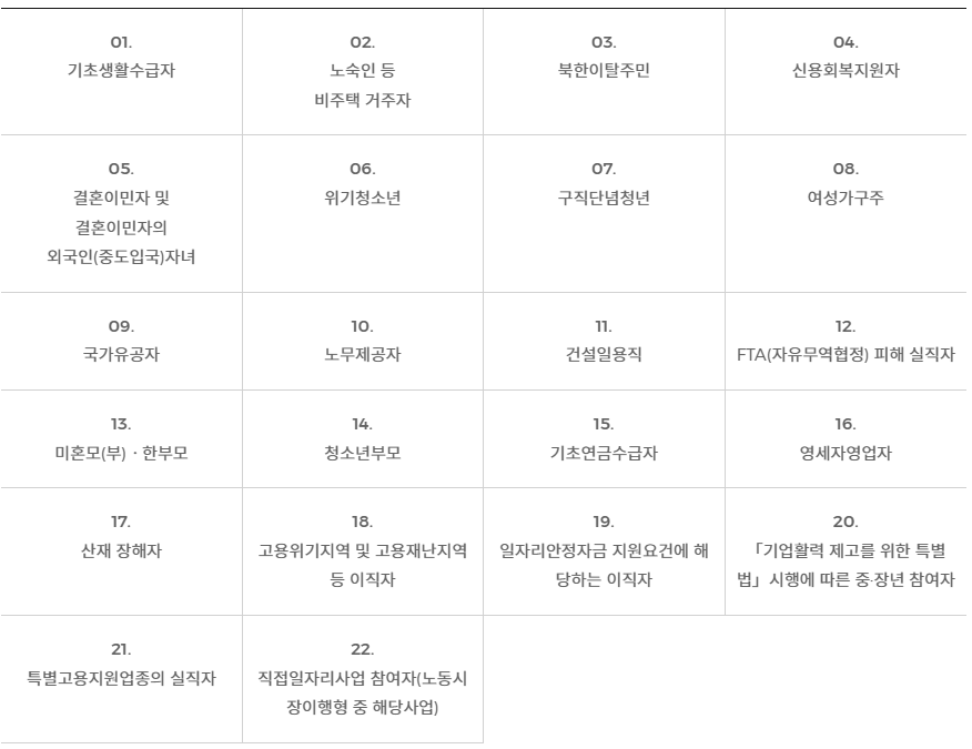 - 정부 재정지원 직접일자리에 참여하고 있거나 참여 종료 후 6개월이 지나지 않는 사람(단 일부사업의 경우 참여 종료 후 즉시 참여 가능/ 중도탈락자는 제외)