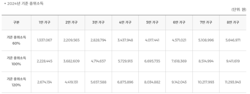 2024년 기준 중위소득(중위소득 : 전체 가구의 소득 순위에서 중간에 해당하는 가구의 소득으로 복지 사업 대상자를 선정하는 기준으로 활용되는 지표)