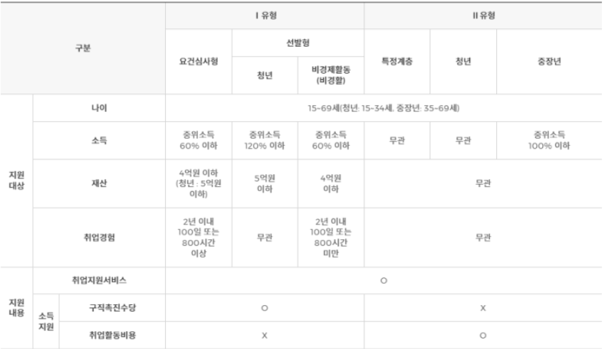 - 가구단위 중위소득 60% 이하이고 재산 4억원(15~34세 청년은 5억원) 이하이면서, 최근 2년 안에 100일 또는 800시간 이상의 취업경험이 있는 사람을 중심으로 합니다.