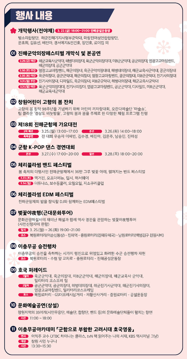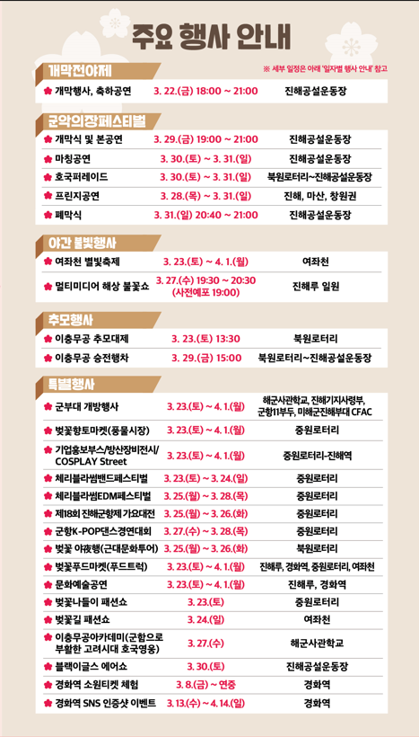 메인프로그램 : 진해군항제 개막식, 군악의장페스티벌(개막식, 마칭공연), 이충무공 추모대제, 이충무공 승전행차, 블랙이글스 에어쇼, 체리블라썸밴드페스티벌, 체리블라썸EDM페스티벌, 진해군항제 가요대전, 군항K-POP댄스경연대회