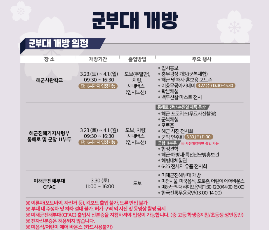 진해군항제는 다른 벚꽃축제와 다르게 군부대를 개방하는 행사 또한 진행합니다.